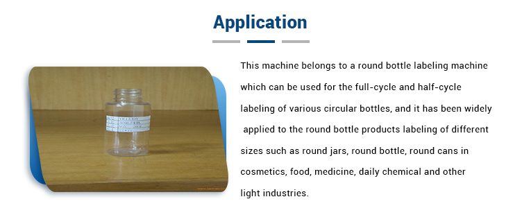 हे मशीन एक गोल बॉटल लेबलिंग मशीनचे आहे जे विविध परिपत्रक बाटल्यांच्या पूर्ण-सायकल आणि अर्ध-चक्राच्या लेबलिंगसाठी वापरले जाऊ शकते आणि हे गोल जार, गोल बाटली अशा वेगवेगळ्या आकाराच्या गोल बाटली उत्पादनांना मोठ्या प्रमाणात लागू केले गेले आहे. सौंदर्यप्रसाधने, अन्न, औषध, दैनंदिन केमिकल आणि इतर प्रकाश उद्योगांमध्ये गोल कॅन