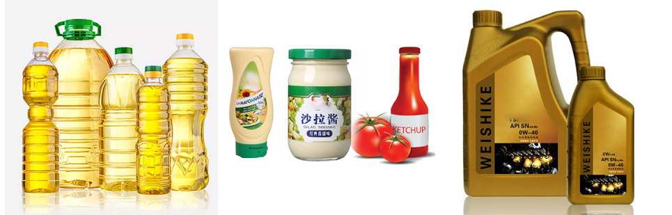 खाद्यतेल (तीळ, ऑलिव्ह, शेंगदाणे / ब्लेंड .इटीसी) केचप, अंडयातील बलक, मिरची सॉस इ. वंगण घालणारे तेल + विशेष सॉल्व्हेंट्स इ.